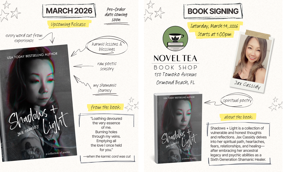 Shadows + Light is a collection of vulnerable and honest thoughts and reflections. Jax Cassidy delves into her spiritual path, heartaches, fears, relationships, and healing—after embracing her ancestral legacy and psychic abilities as a Sixth Generation Shamanic Healer.